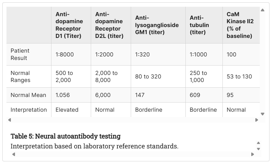 Given concern for an immune-mediated process, the Autoimmune Brain Panel™ (formerly the Cunningham Panel™) was ordered. The results demonstrated elevated anti-dopamine receptor D1 antibodies, with borderline anti-Lysoganglioside GM1 and anti-tubulin antibodies, findings that supported an underlying autoimmune dysfunction.